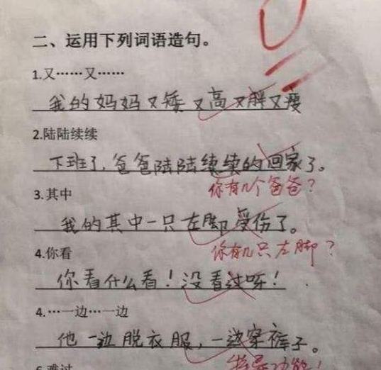 这位同学的造句可以说是“伤敌一千,自损八百”,着实是“坑家长”的小能手,确定爸爸妈妈不会给你来一顿“棒子炖肉”吗?真是替这孩子捏了把汗。