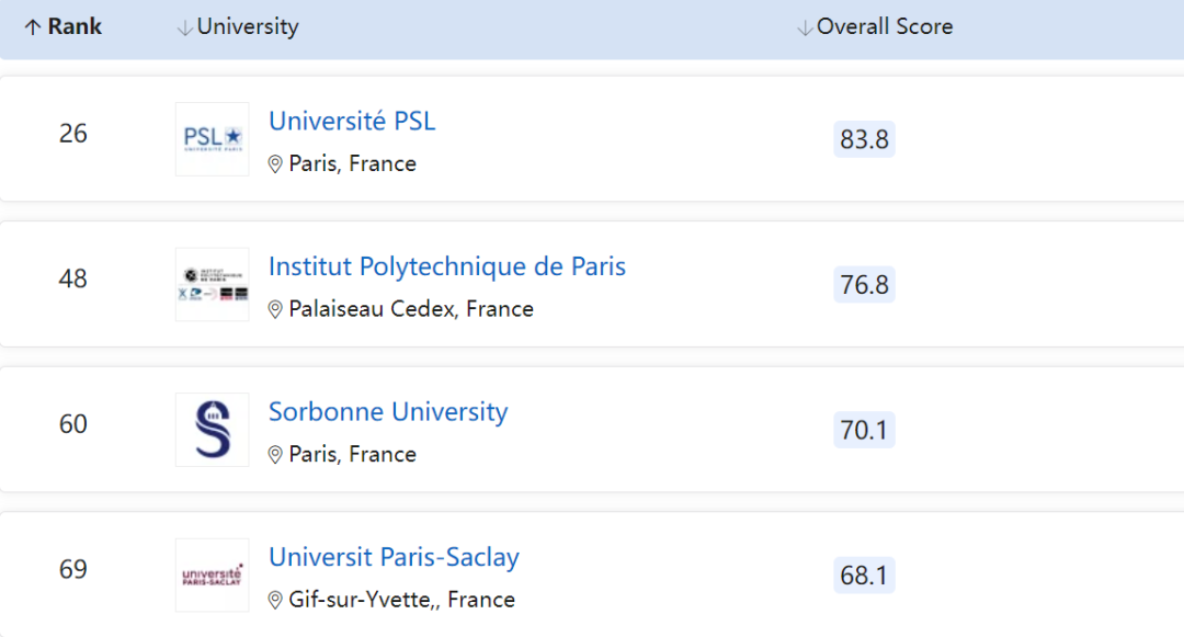 另外3所进入TOP100榜单的分别是巴黎理工学院、索邦大学和巴黎萨克雷大学。