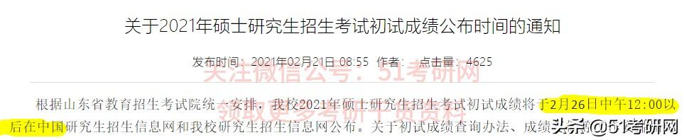 根据山东省教育招生考试院统一安排,我校2021年硕士研究生招生考试初试成绩将于2月26日中午12:00以后在中国研究生招生信息网和我校研究生招生信息网公布。