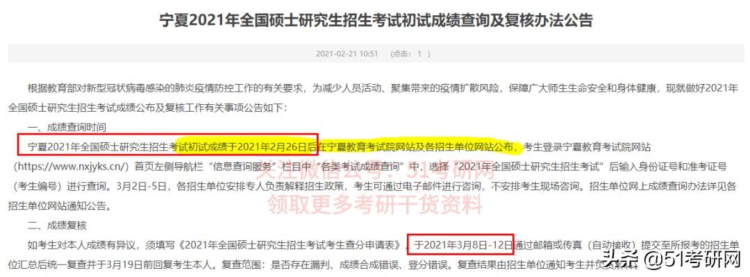 宁夏2021年全国硕士研究生招生考试初试成绩于2021年2月26日后在宁夏教育考试院网站及各招生单位网站公布。