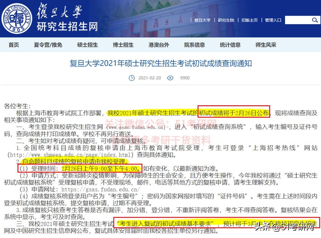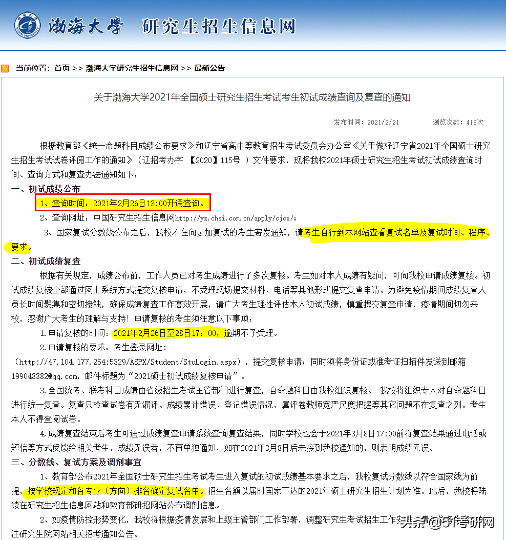初试成绩查询时间:2021年2月26日13:00。