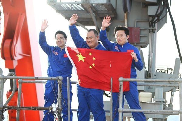 载人深潜英雄崔维成(左,1981级力学系)、叶聪(中)、张东升(右,1997级电子系)