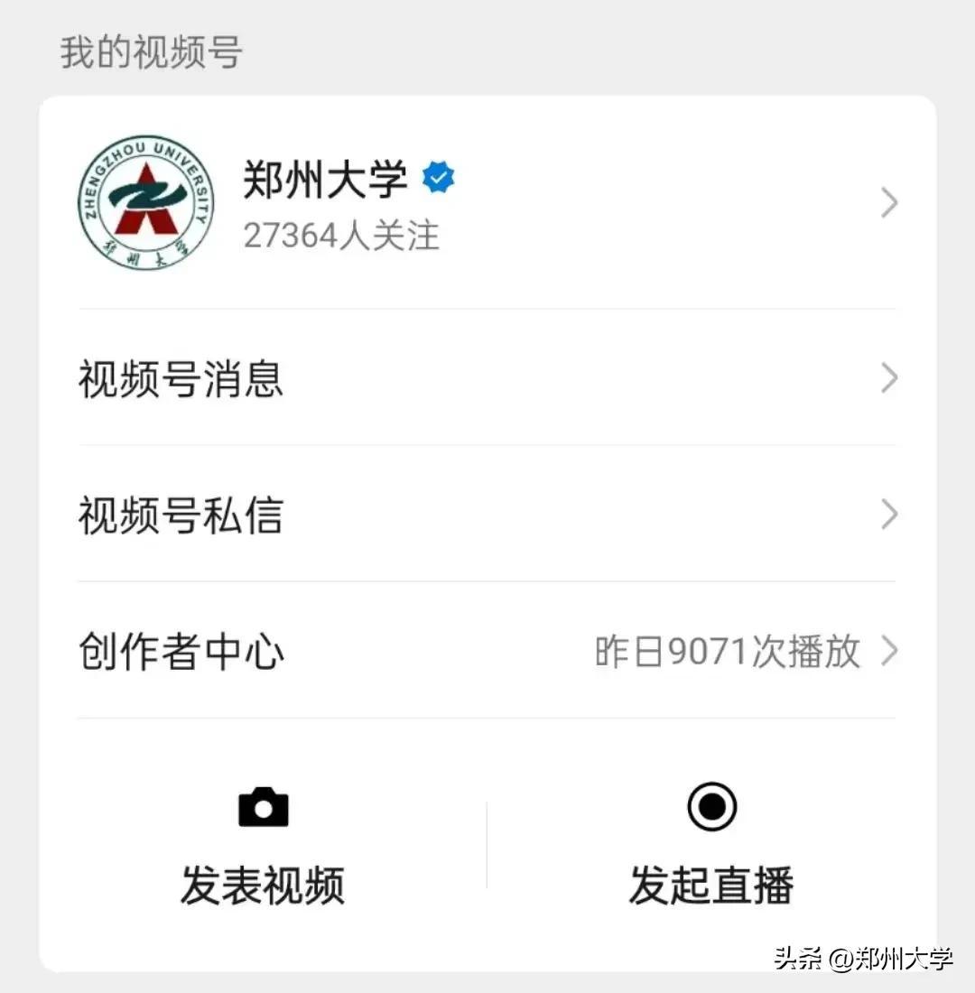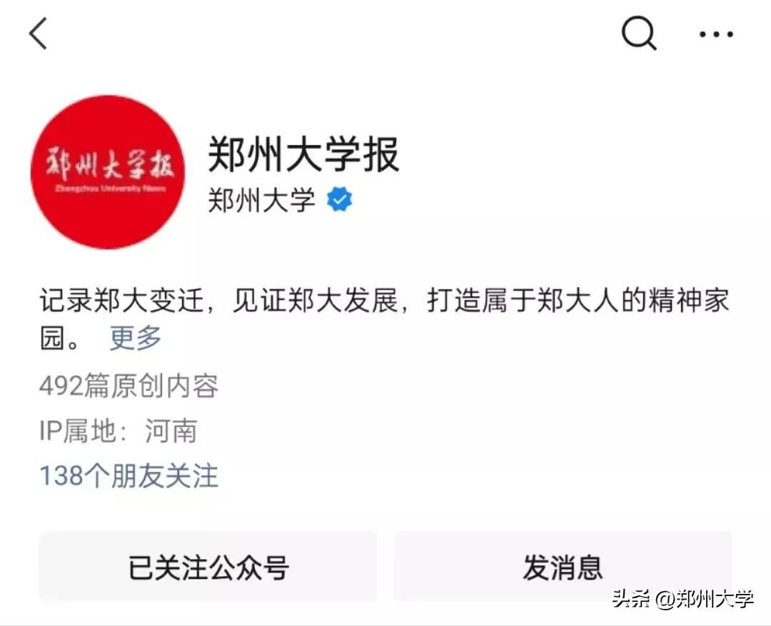 郑州大学官方微信成立于2014年5月,隶属于郑州大学党委宣传部,主要负责郑州大学官方微信公众号及视频号的策划与运营。郑州大学官方微信公众号现有粉丝36万+,以平均1日1更的速度发布推文,多篇优质文章被各大媒体转载;郑州大学官方视频号现有粉丝2万+。