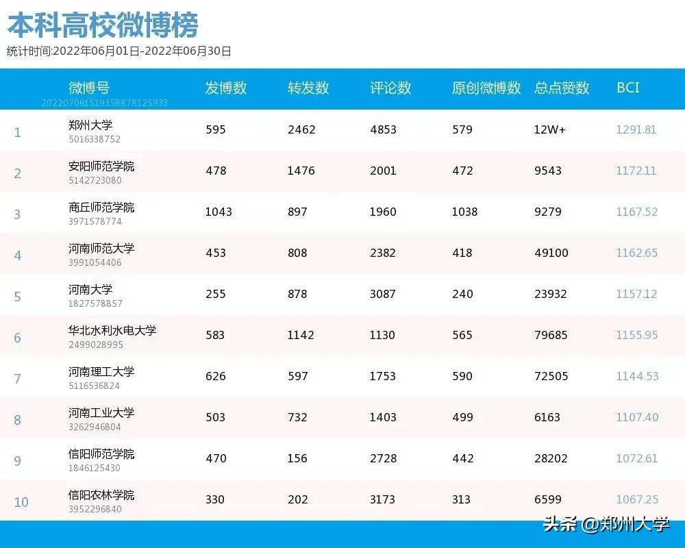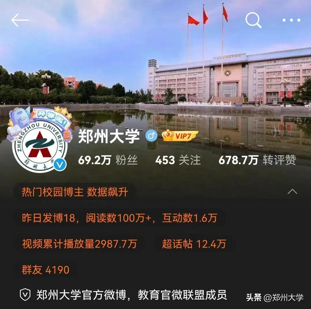 作为郑州大学官方正式的发声平台,郑州大学官方微博不仅代表着郑州大学,为郑州大学师生提供官方信息,也成为社会人士了解郑州大学的一个渠道,是郑州大学信息发布的平台和展示学校形象的名片。曾多次在高校微博影响力排行中名列前10,连续4年获得“最具影响力高校官微”,微博影响力位列部省合建高校第一。