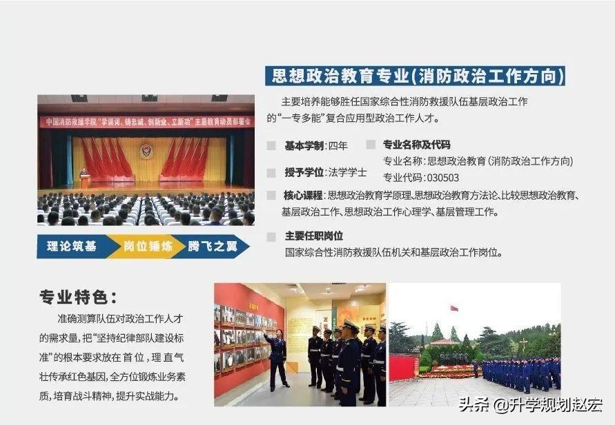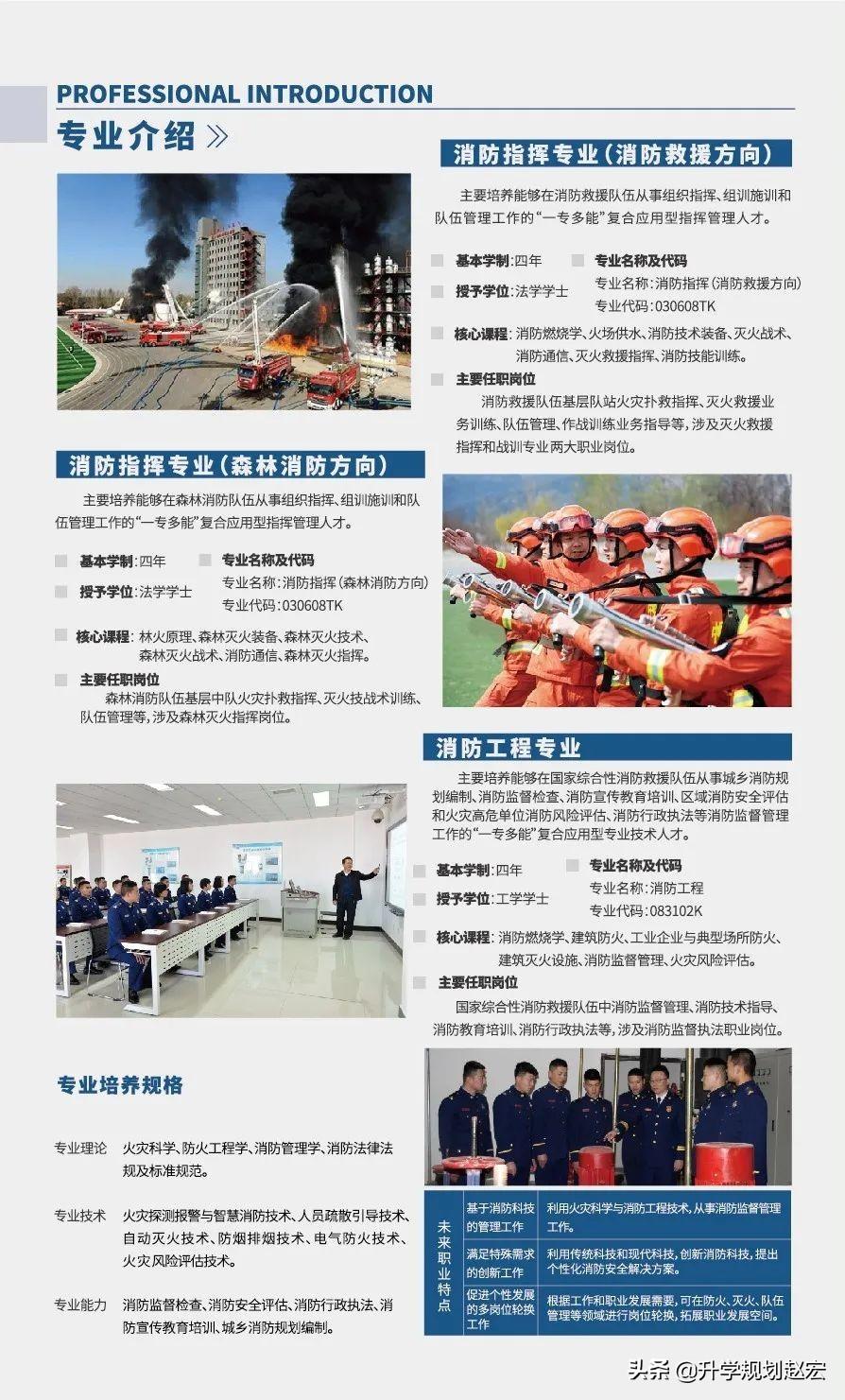 中国消防救援学院,是应急管理部直属全日制普通高等院校。学院前身为武警警种学院,以森林防灭火为核心,以黄金地质勘查、水电建筑、桥梁工程和抢险救援为支撑的人才培养体系。2020年招收消防指挥、消防工程、飞行器控制与信息工程、抢险救援指挥与技术、思想政治教育5个本科专业,需要面试和政审;