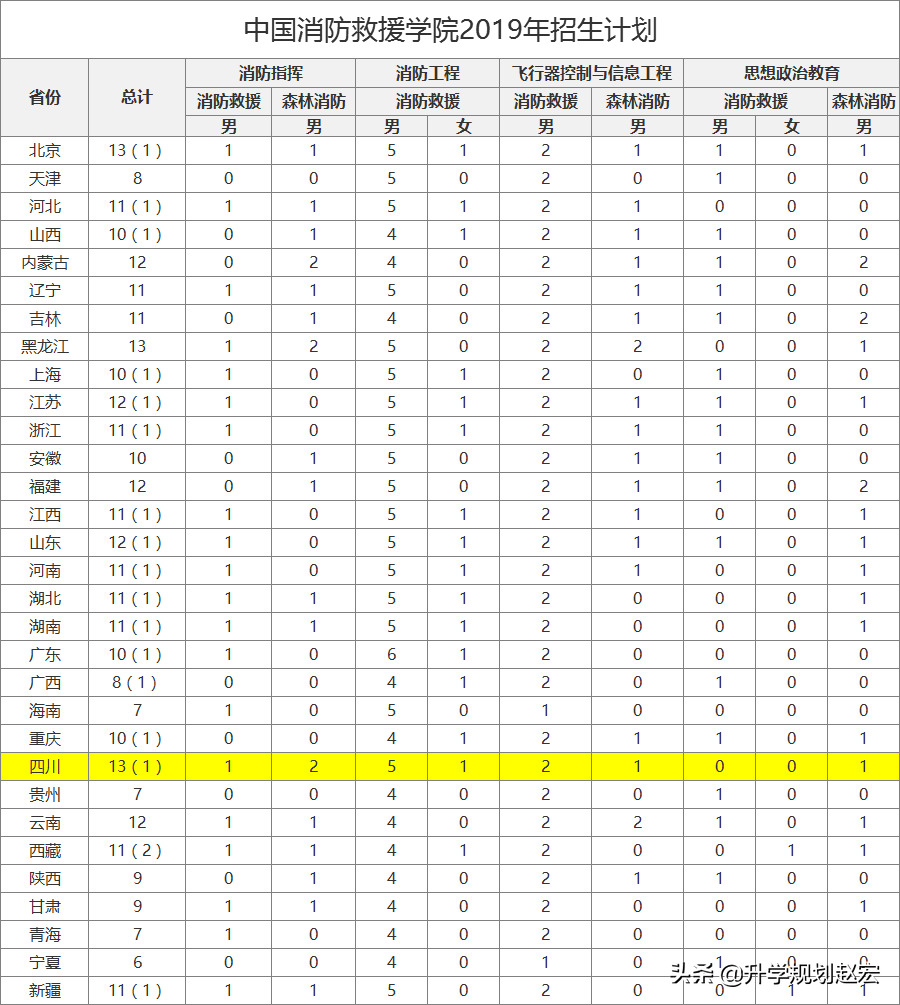 从中国消防救援学院2019年招生情况来看,全国总共招生320人,其中女生人数18人;思想政治教育专业只招文科,招生人数40人;其他专业只招生理科生;四川招生人数14人,男生13人,女生1人;