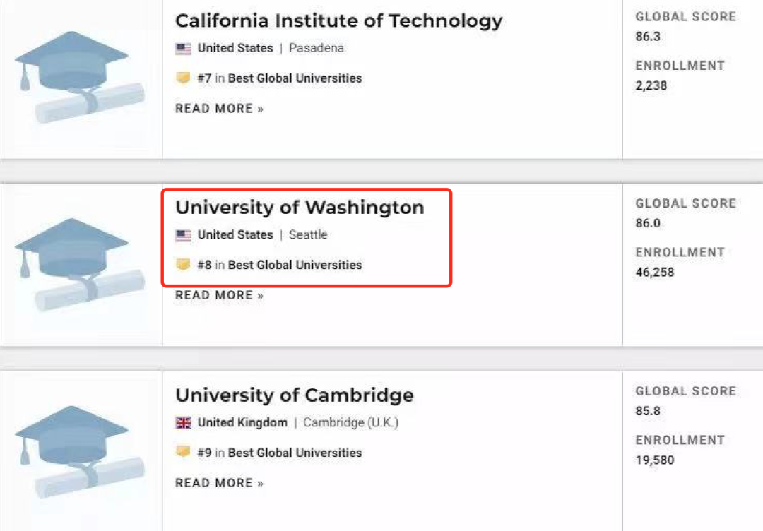 而UW的世界排名,更紧随哈佛MIT等名校之后,是妥妥的世界第8!(2021U.S. News)