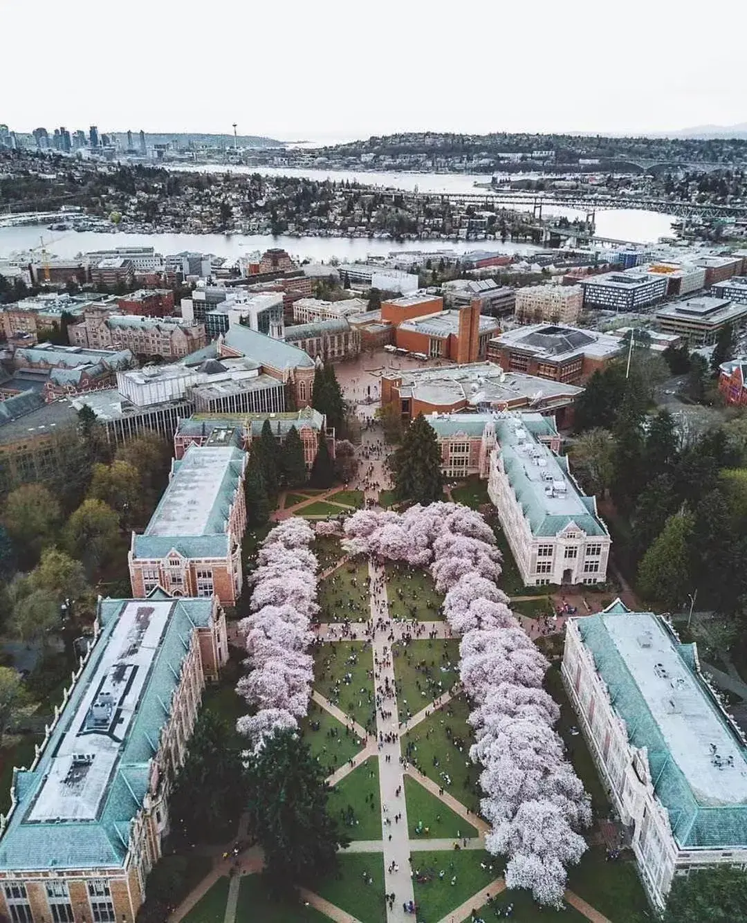 每年春天,The Quad盛开的樱花都会让UW变得如梦如幻,吸引着无数游客前来观赏和拍照。