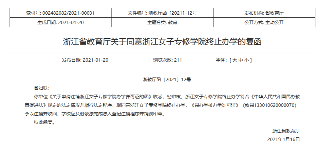 1月20日,从浙江省教育厅传来消息,浙江省女子专修学院停止办学。