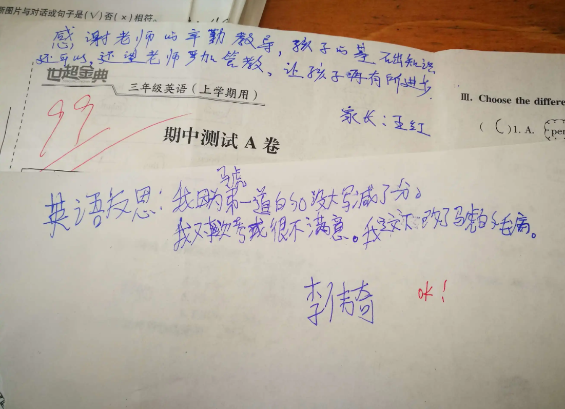 我们原来以为家长签字就签上一个名字完事,其实并不是,负责的家长会认真阅读孩子的试卷,找到孩子存在的问题,从错误中发现孩子知识的薄弱点,然后帮助孩子各个击破,这样孩子下一次就不会犯同样的错误了。