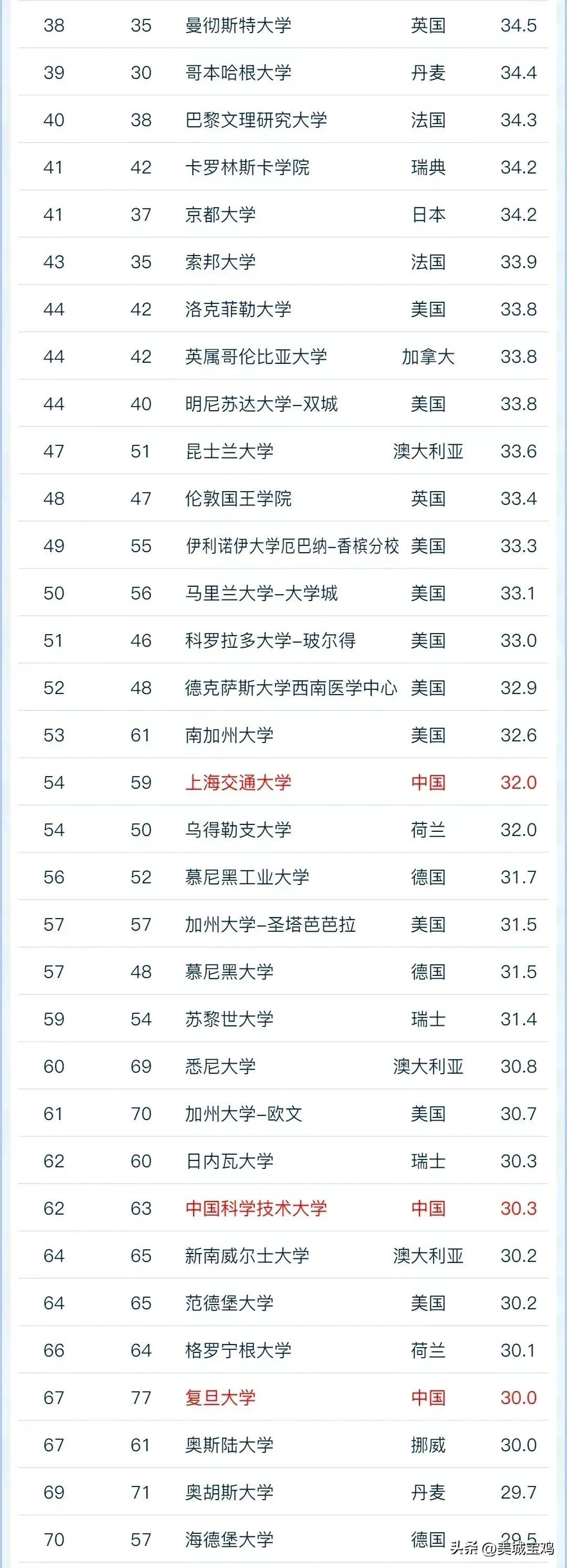 亚洲排名第一的是东京大学,居第24位,大洋洲第一省墨尔本大学,排名第33位。
