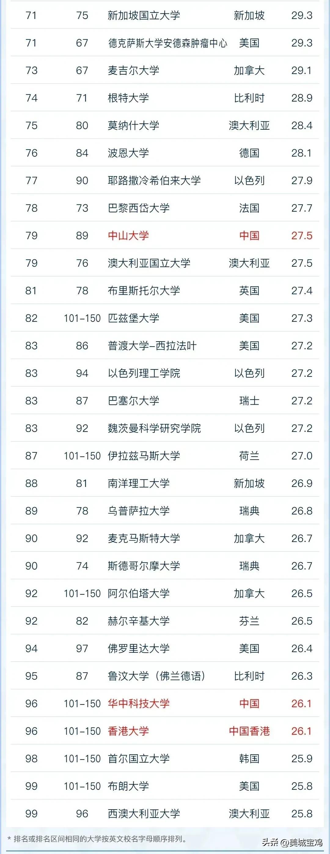 值得注意的是,香港大学同样排名并列第96位,全国并列第8位,这个排名未免太低了。而南京大学、西安交通大学、武汉大学、哈尔滨科技大学等名校都没能进入全球百强榜单,还是略显遗憾的。