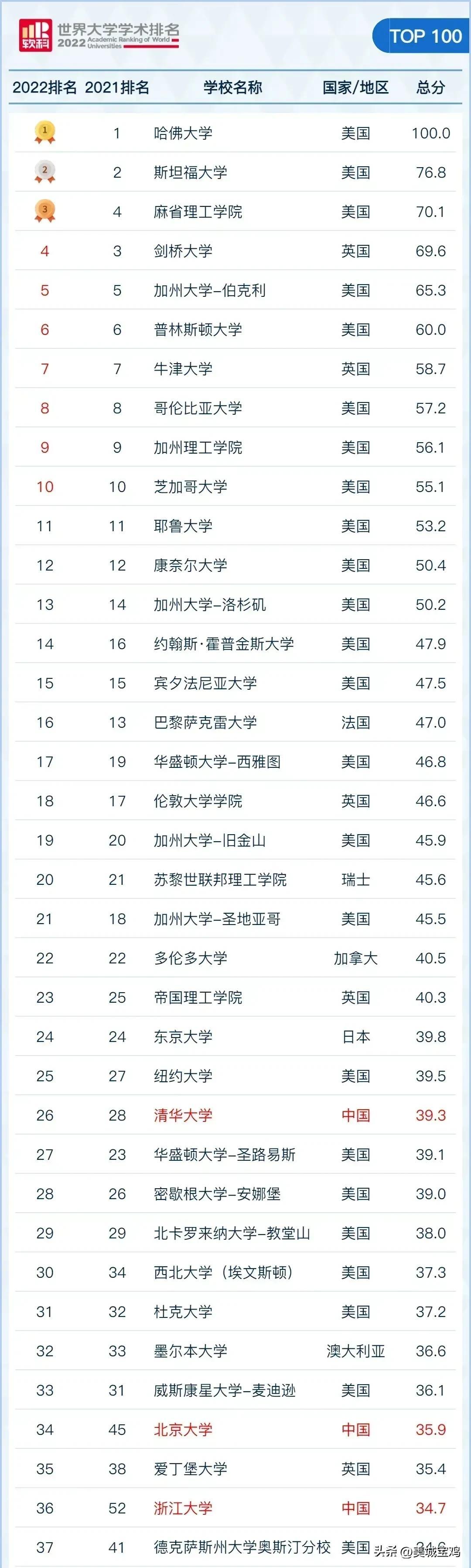 下面看看这个由软科科发布的最新世界大学学术排名百强榜,哈佛大学以100分的满分高居榜首,斯坦福大学紧随其后,麻省理工大学排名第三,剑桥大学和加州大学伯克利分校居前五位。