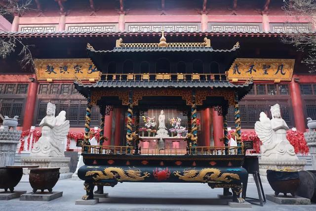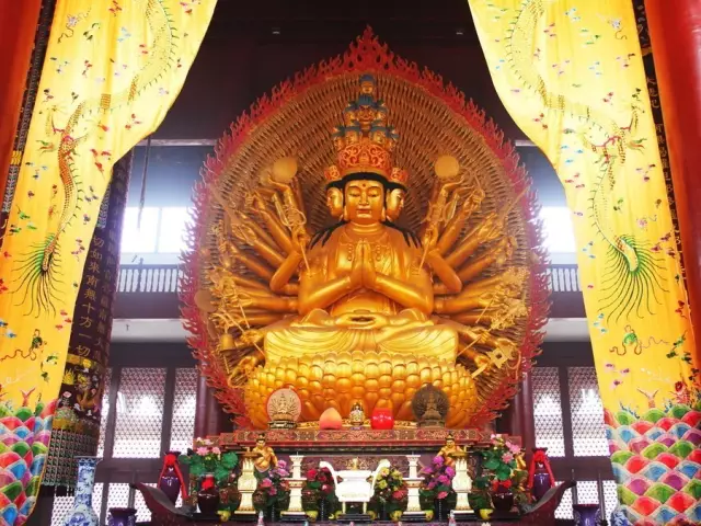 寺院内,所有圣像都是国内顶级雕刻大师之作,雕刻细腻传神、刀法流畅、线条优美,佛像颜面红润,菩萨像慈眉善目、安静平和,充分彰显了大慈大悲之意。