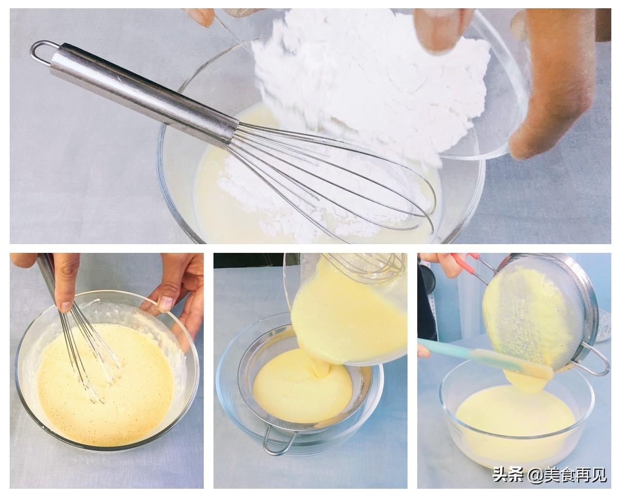 将过筛好的粉类全部加入蛋液中,一起搅拌均匀。然后再加粉筛过滤一次,直至蛋液中完全无颗粒,放至一边备用。
