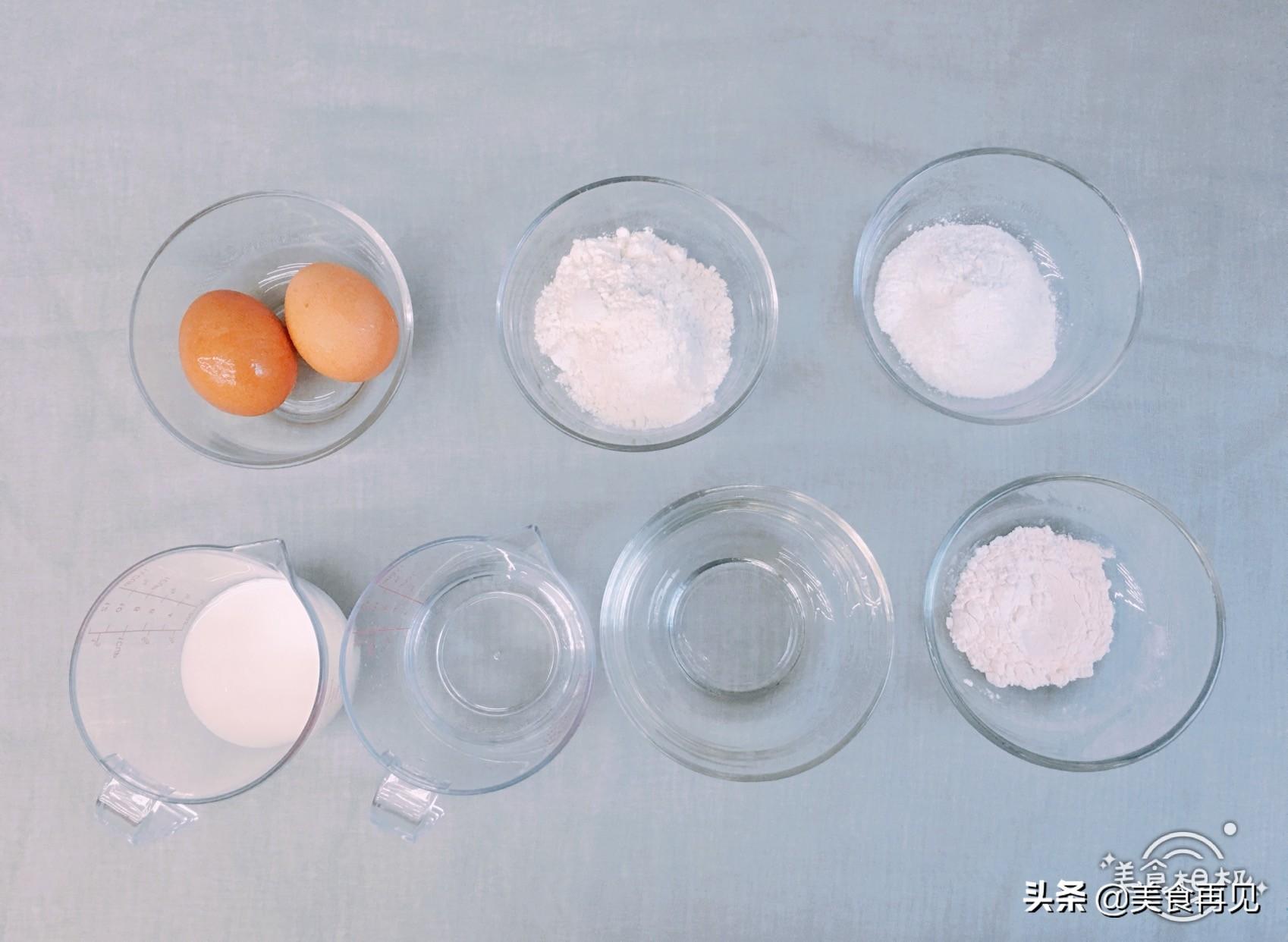 低筋面粉90克,糯米粉45克,吉士粉15克,鸡蛋4个,纯净水150克,牛奶90克,糖浆30ml