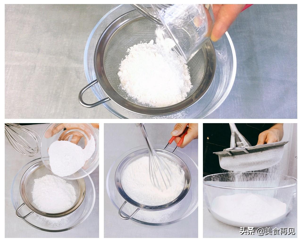 然后再将低筋面粉、糯米粉和吉士粉一起过筛,去除粉中的小颗粒。