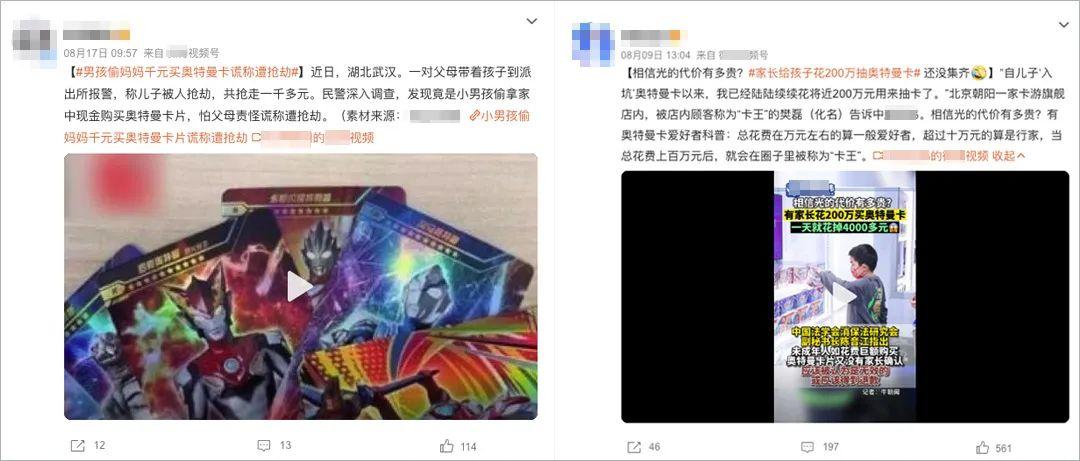 新闻中,「男孩偷妈妈千元买奥特曼卡谎称遭抢劫」、「家长给孩子花200万抽奥特曼卡」。