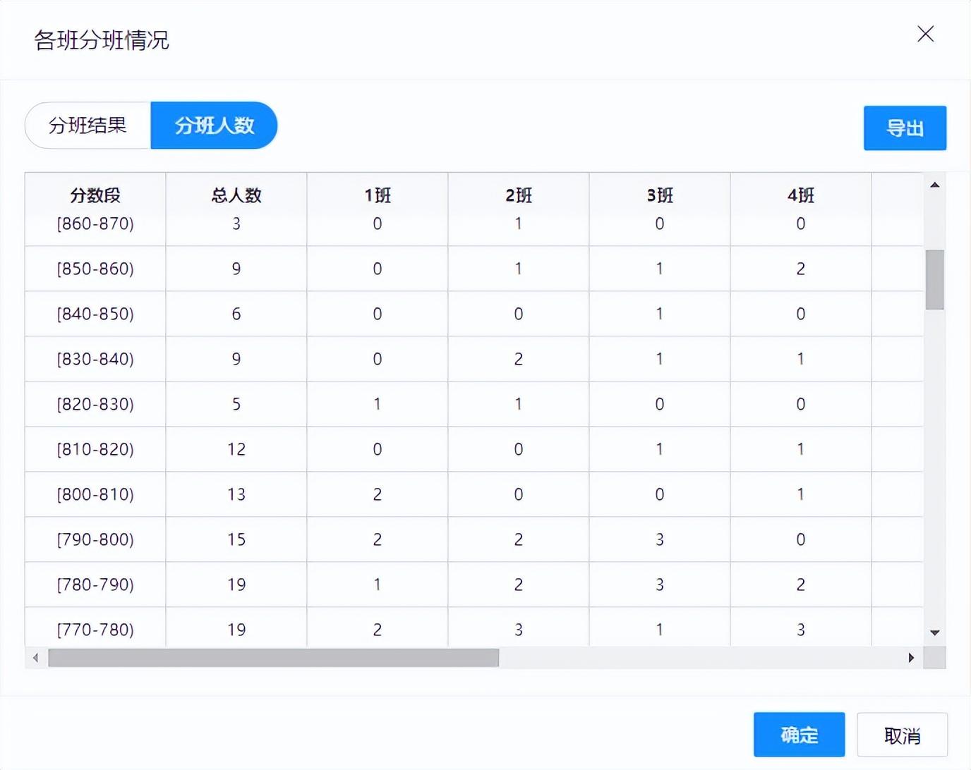 分班完成后,可以查看各班级人员名单,以及各班分班情况,如男女人数、各科成绩平均分、均差值、分数段人数等,支持导出excel;