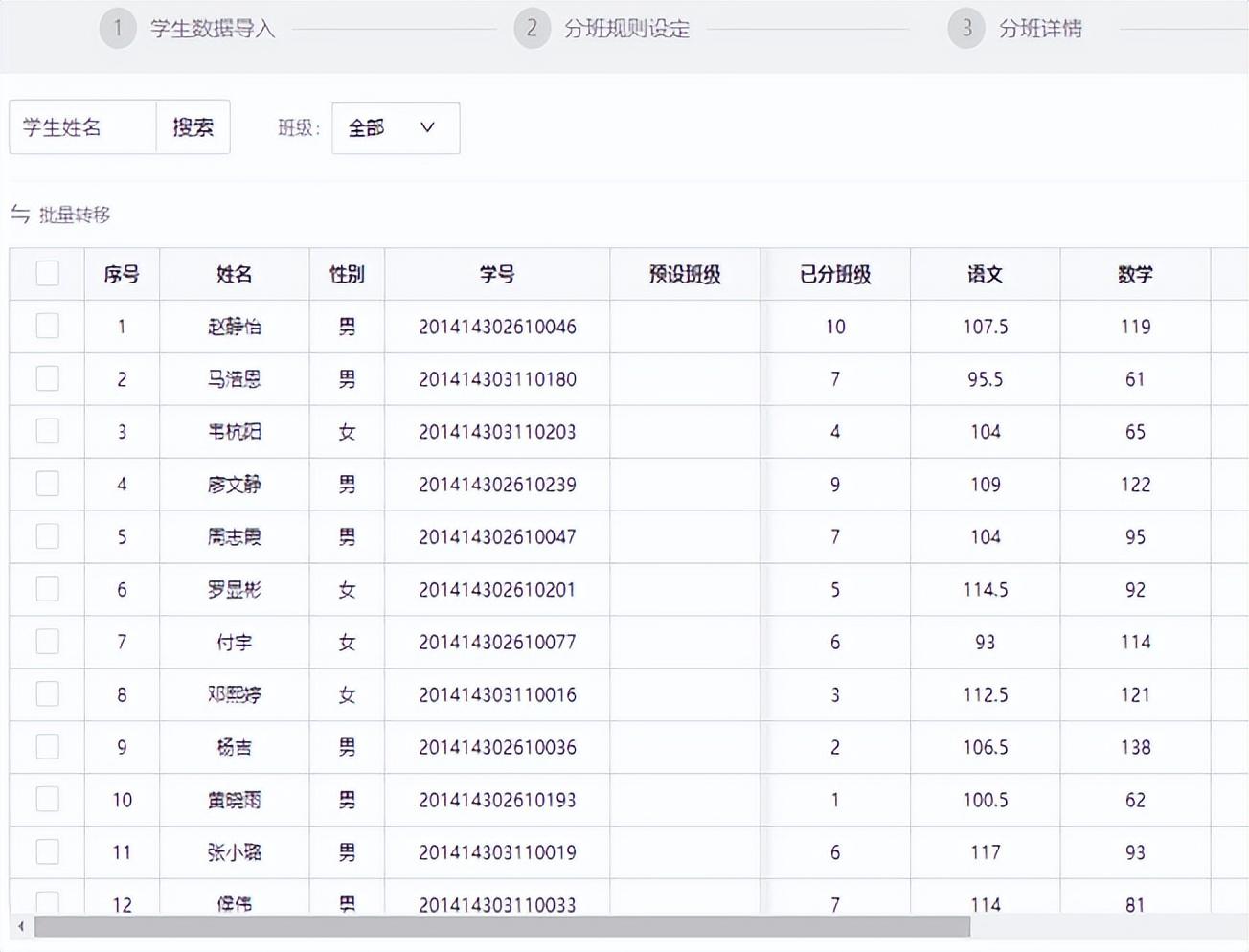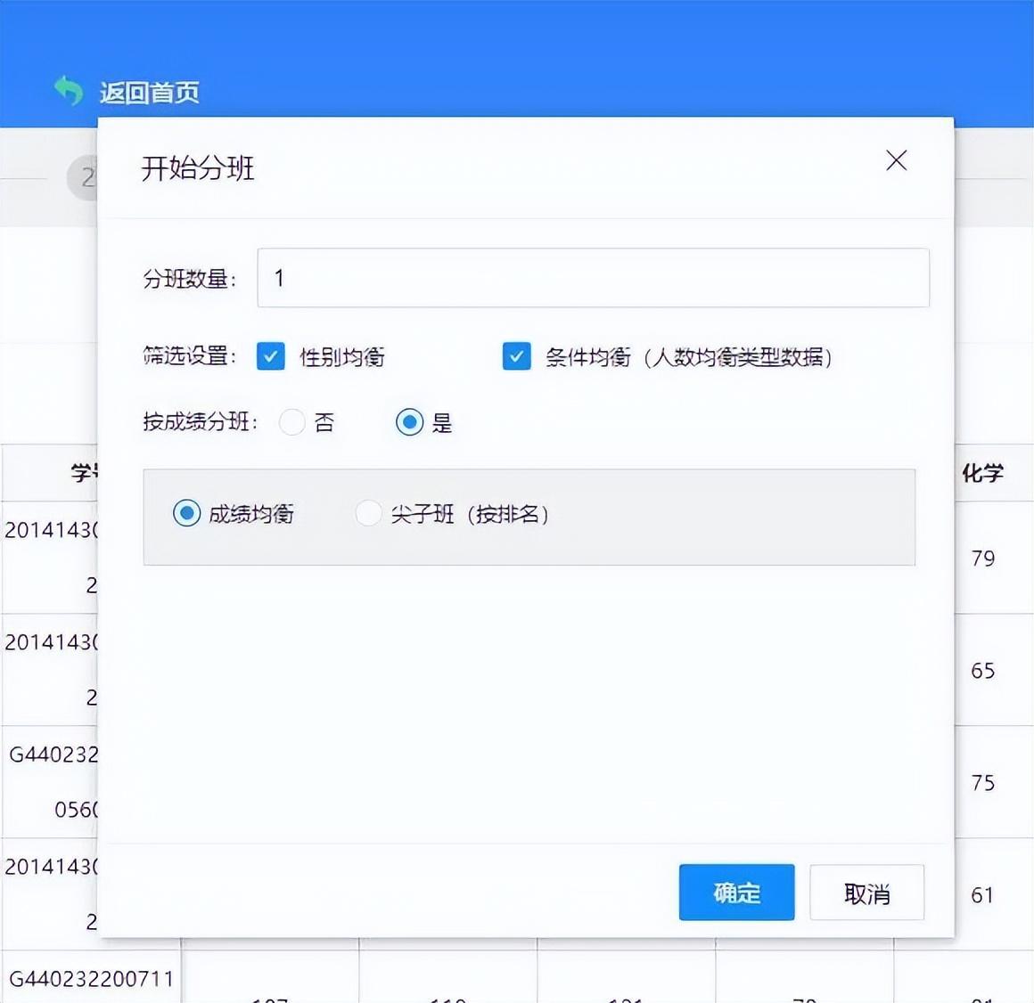 设置班级数量、选择是否性别均衡、条件均衡、是否按照成绩分班(成绩均衡、尖子班(按排名)2种情况)开始分班。未分进去的学生则会在未分班列表中;