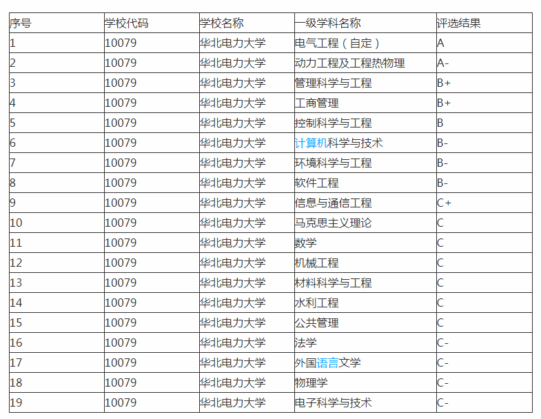 在教育部第四轮学科评估中,最高评级为A,电气工程。A-,动力工程及工程热物理。B+,管理科学与工程、工商管理。B,控制科学与工程。B-,计算机科学与技术、环境科学与工程、软件工程。C+,信息与通信工程。C,马克思主义理论、数学、机械工程、材料科学与工程、水利工程。公共管理C-,法学、外国语言文学、物理学、电子科学与技术,高水平学科数量和质量都为河北省参评高校之冠。