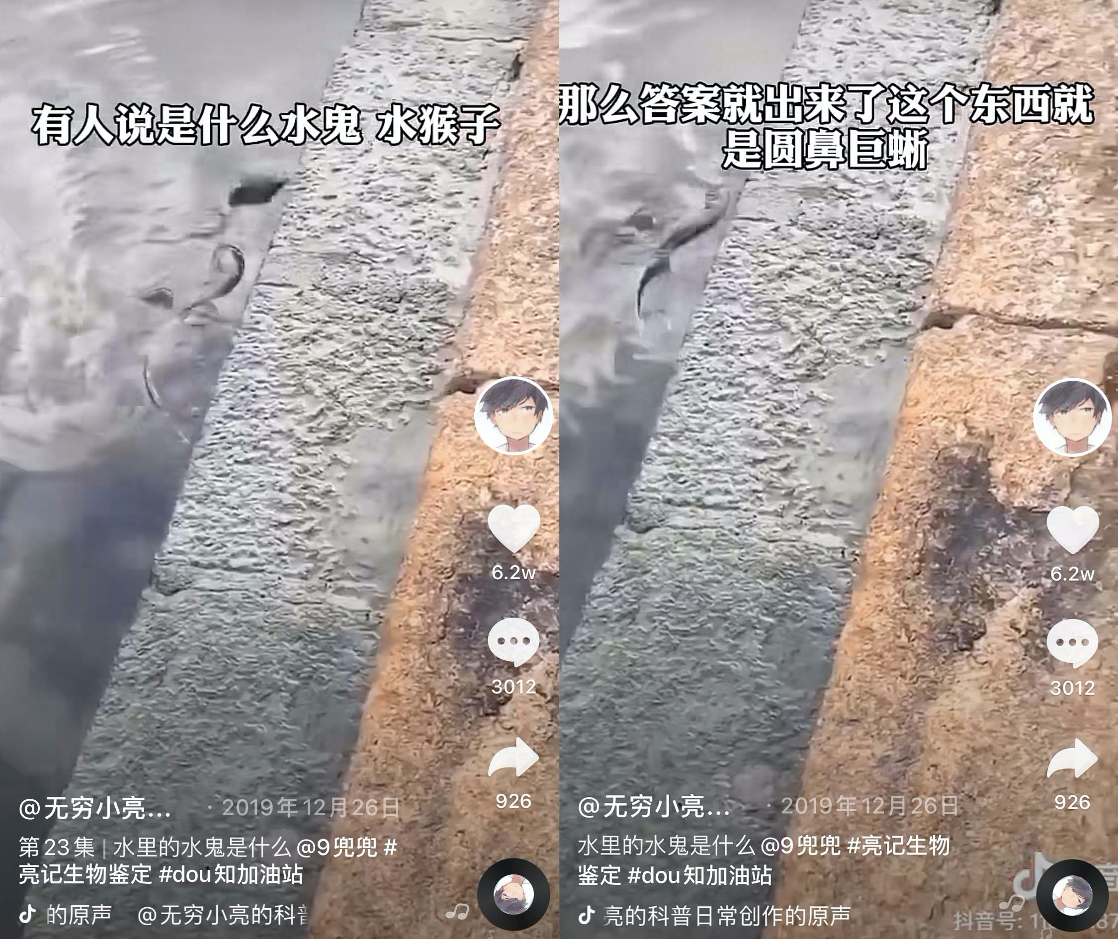 更重要的是,因为“鉴定系列”视频小亮的“水猴子”梗在抖音上重新复活了。这几年总有人说自己拍到了生活在水里的、外形似猿猴的“水猴子”,网友顺着网线问到小亮时,总让他觉得很荒谬。于是小亮的每一期“鉴定视频”都会调侃几句:这是XX,我得赶紧说,要不然过两天又传成水猴子了。