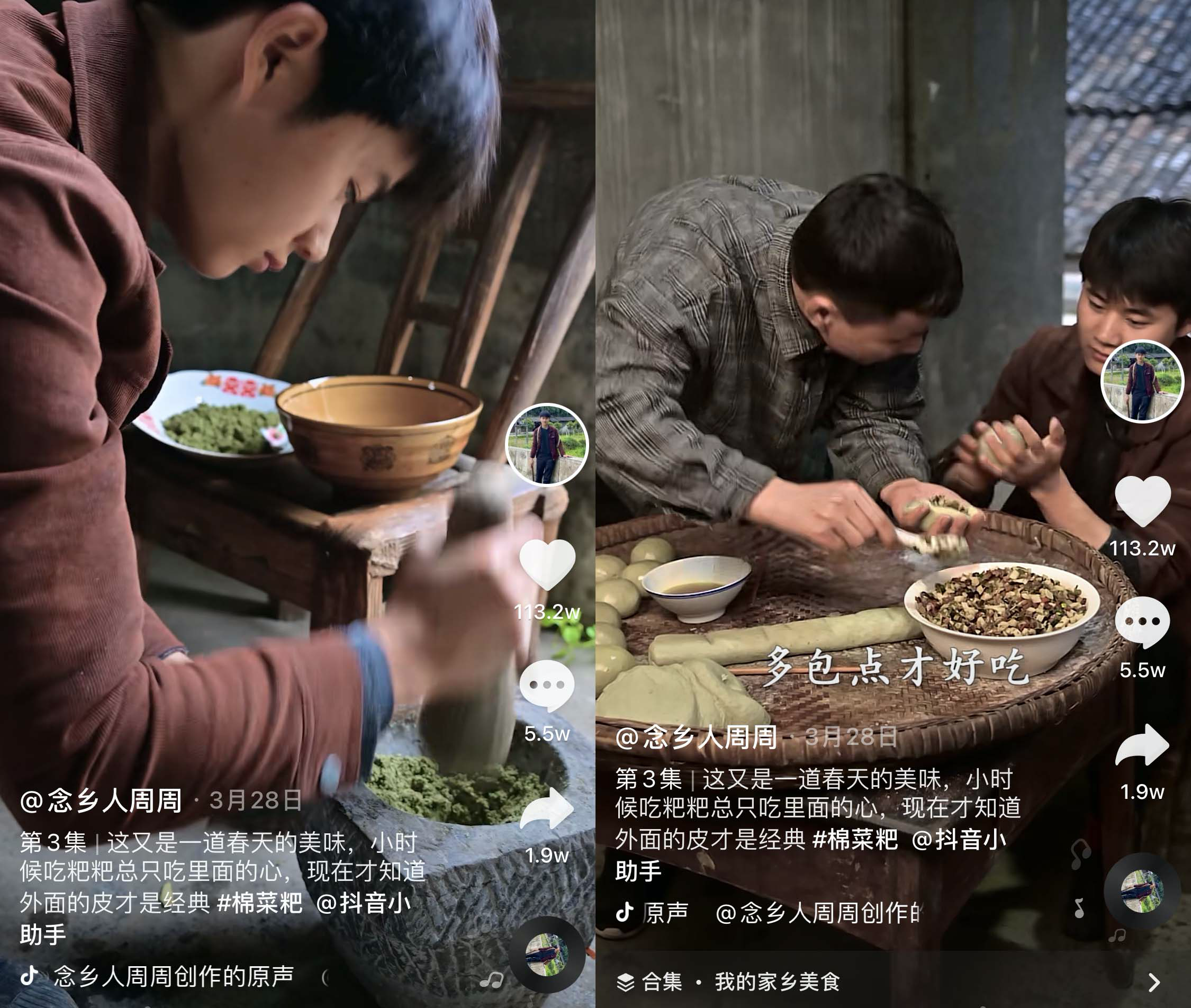 3月28日,周周一条做糯米粑粑的视频获得了113万的点赞,评论中,最高赞的粉丝说“每日必看,不看都不对劲”,第二高赞的粉丝则说:“周周的每个视频都好治愈,可能是因为特别怀念小时候无忧无虑的日子,家里有爷爷奶奶,外公外婆,他们那一辈淳朴而热烈的疼爱。”