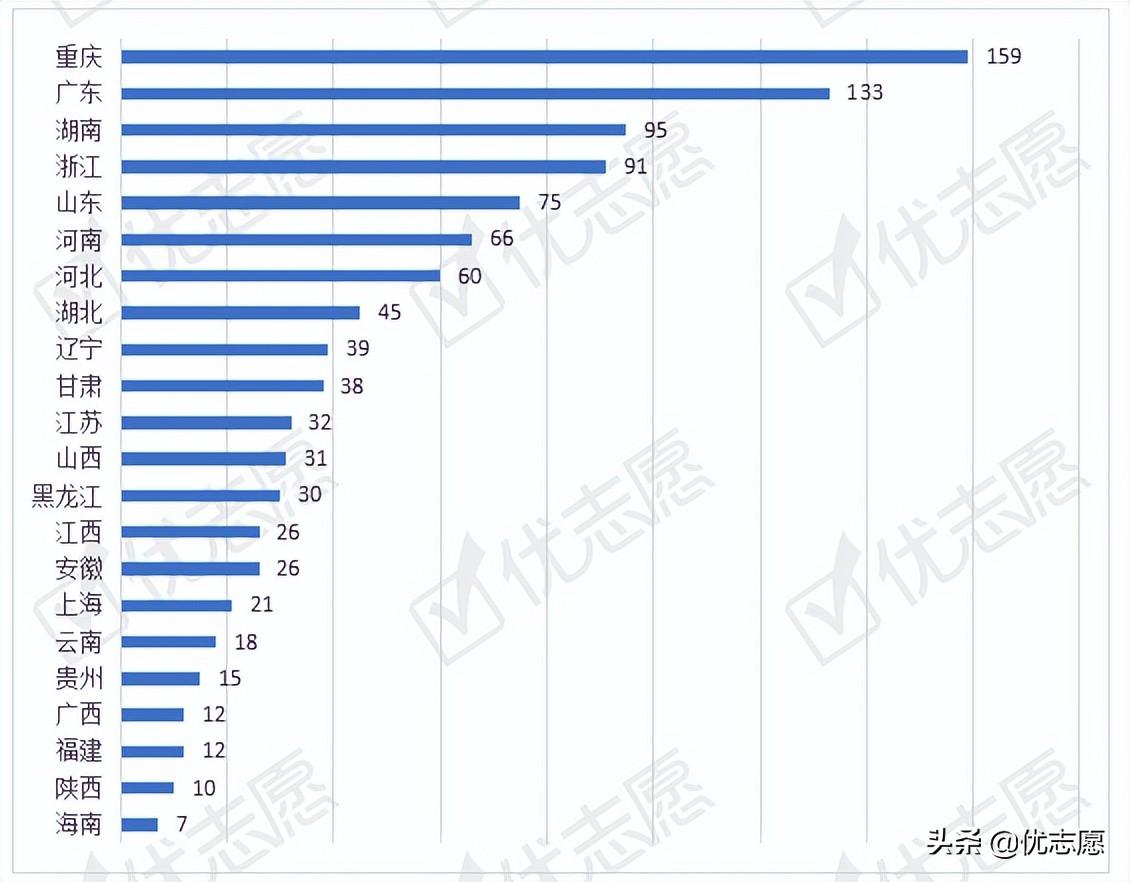 21年川音共计划招生2249人,其中四川省内招生1208人,占比超53%,省外招生1041人,省外计划数略多于省内。下图展示了四川音乐学院2021年在省外各地的招生计划数,重庆和广东地区招生计划数较多。