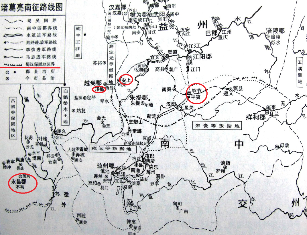南中叛乱,看起来很吓人。其实并没有威胁到蜀汉的核心统治。事实上,雍闿叛乱后,光打个永昌郡就打了三年,毛都没啃下来一点。而越隽郡的治所邛都(今四川西昌东南)虽然被越隽夷王高定占住了,但诸葛亮派去的越隽郡太守龚禄也不过是换个地方、在邛都北部的安上县(今四川屏山县西北)驻守,高定也不敢打过来。另外,南中叛乱爆发后,蜀汉的庲降都督李恢一直驻扎在牂牁郡平夷县(今贵州毕节市)进行镇抚,虽无法平息叛乱,但也好神在在的管着手头的事情,该吃吃该喝喝,完全没有分崩离析落荒而逃的感觉。