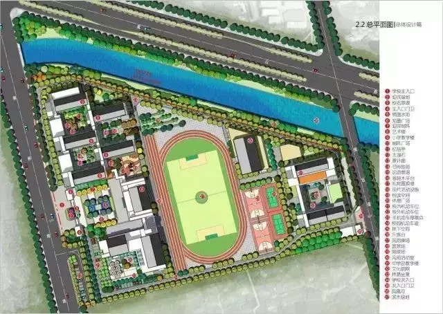 规划有3幢小学教学楼、1幢初中部教学楼、1幢综合实验楼,以及行政楼、食堂综合楼、报告厅和风雨操场;同时配备4个标准篮球场、300米塑胶田径场等。
