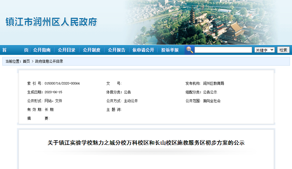 据悉,2020年决定正式启用镇江市长山学校(工程建设名),作为镇江实验学校魅力之城分校的一个校区(长山校区)。
