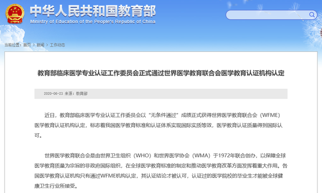 对于众多医学院学生而言,曾经担心一个问题,自己在国内获得了临床医学专业认证,那么将来在国际上是否会得到同等认可呢?如果不被认可,那么将来在执业过程中确实会遇到一定的麻烦。而要想被全球健康卫生行业认可,那么教育部临床医学专业认证工作委员会就必须通过世界医学教育联合会(WFME)医学教育认证机构的认定,所以这项工作教育部一直当作一项重点工作在抓。