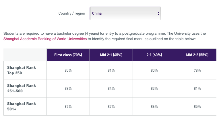 与艺术类院校不过分强调本科背景不同的是,拉夫堡大学对于学生的本科学历有着非常明确的规定。拉夫堡以ARWU为准,要求学生在确认符合以下条件后进行申请:
