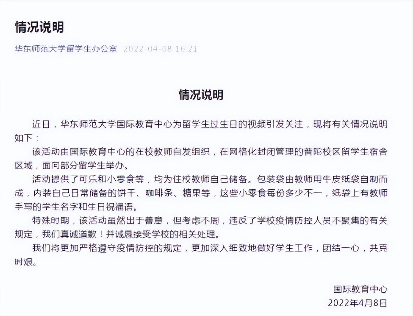 大家对于华东师大国际教育中心教师在疫情期间违规给留学生过生日的情况,有什么看法?欢迎留言讨论,感谢您的阅读!