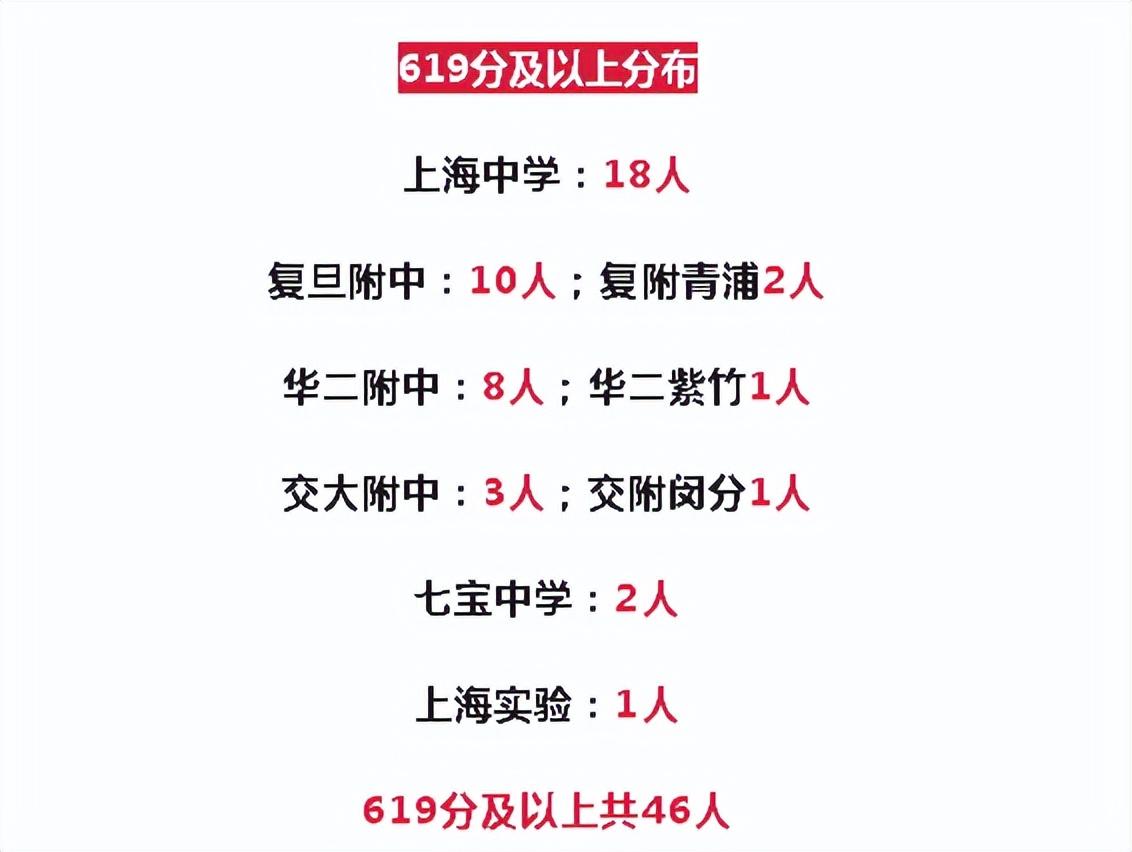 上海教育部门对2022年考生高考成绩分数公布了,我们可以看出,今年考取619分及以上的学生们共有46人,能考这个成绩的学生们那都是学霸级别的人物,那么我们根据这46名学生他们分别来自上海中学18人,复旦附中10人,复附青浦2人,华二附中8人,华二紫竹1人,交大附中3人,交附闵分1人,七宝中学2人,上海实验1人。