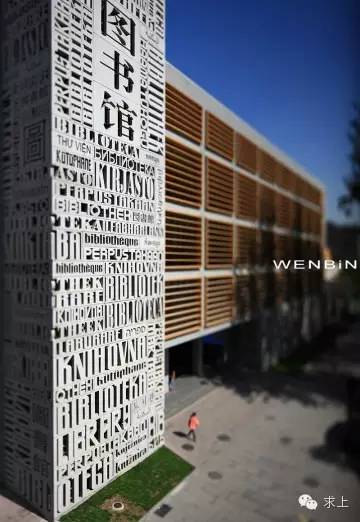北外图书馆是北外校园内的标志性建筑之一。图书馆共六层,大门外侧的多语种装饰墙由55种语言组成。