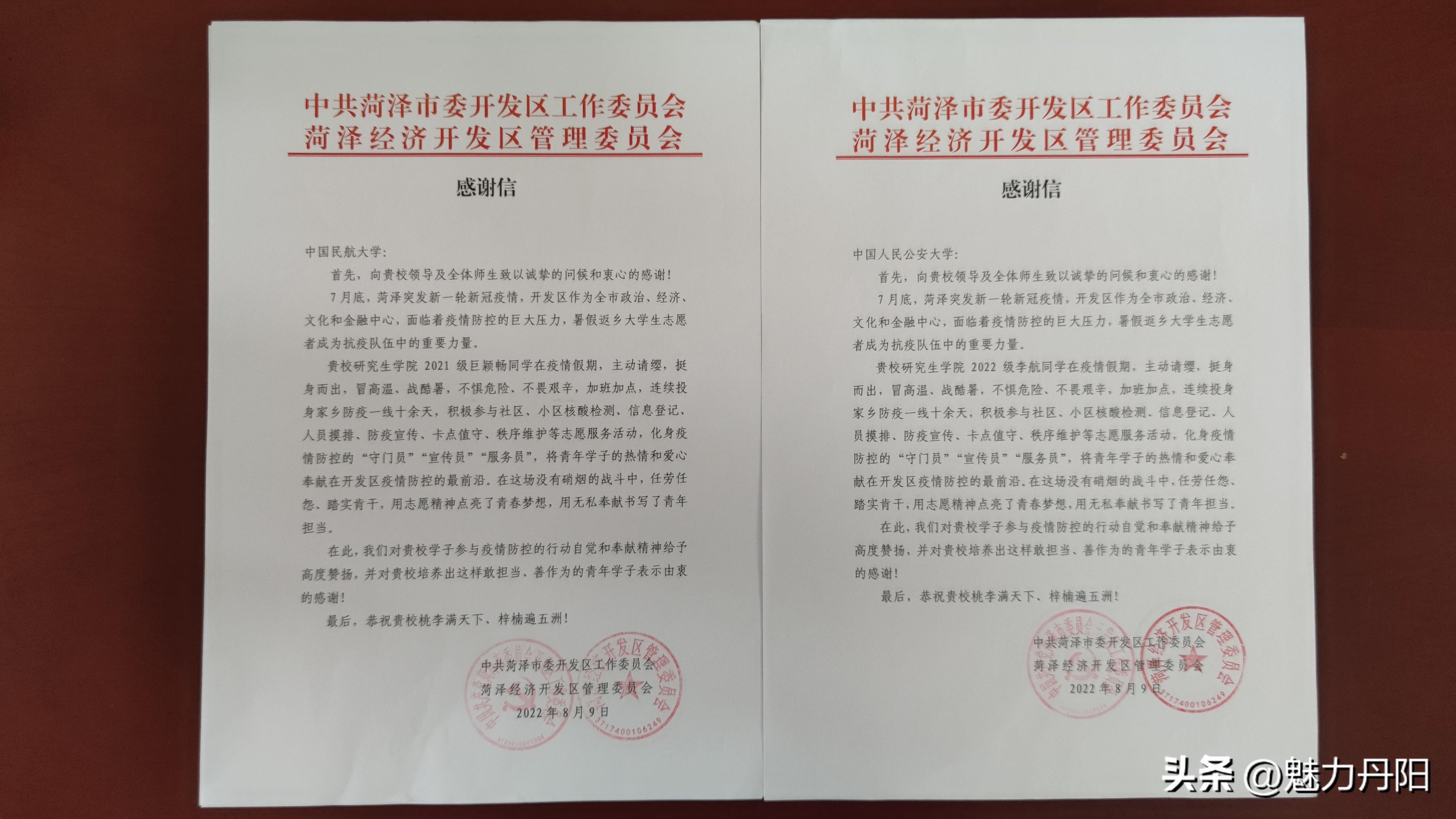 8月11日,中共菏泽市委开发区工作委员会、菏泽经济开发区管理委员会分别向中国人民公安大学、中国民航大学等5所高等院校发出感谢信。对高校学子参与家乡疫情防控的行动自觉和奉献精神给予高度赞扬,对高校培养出这样敢担当、善作为的青年学子表示由衷的感谢!
