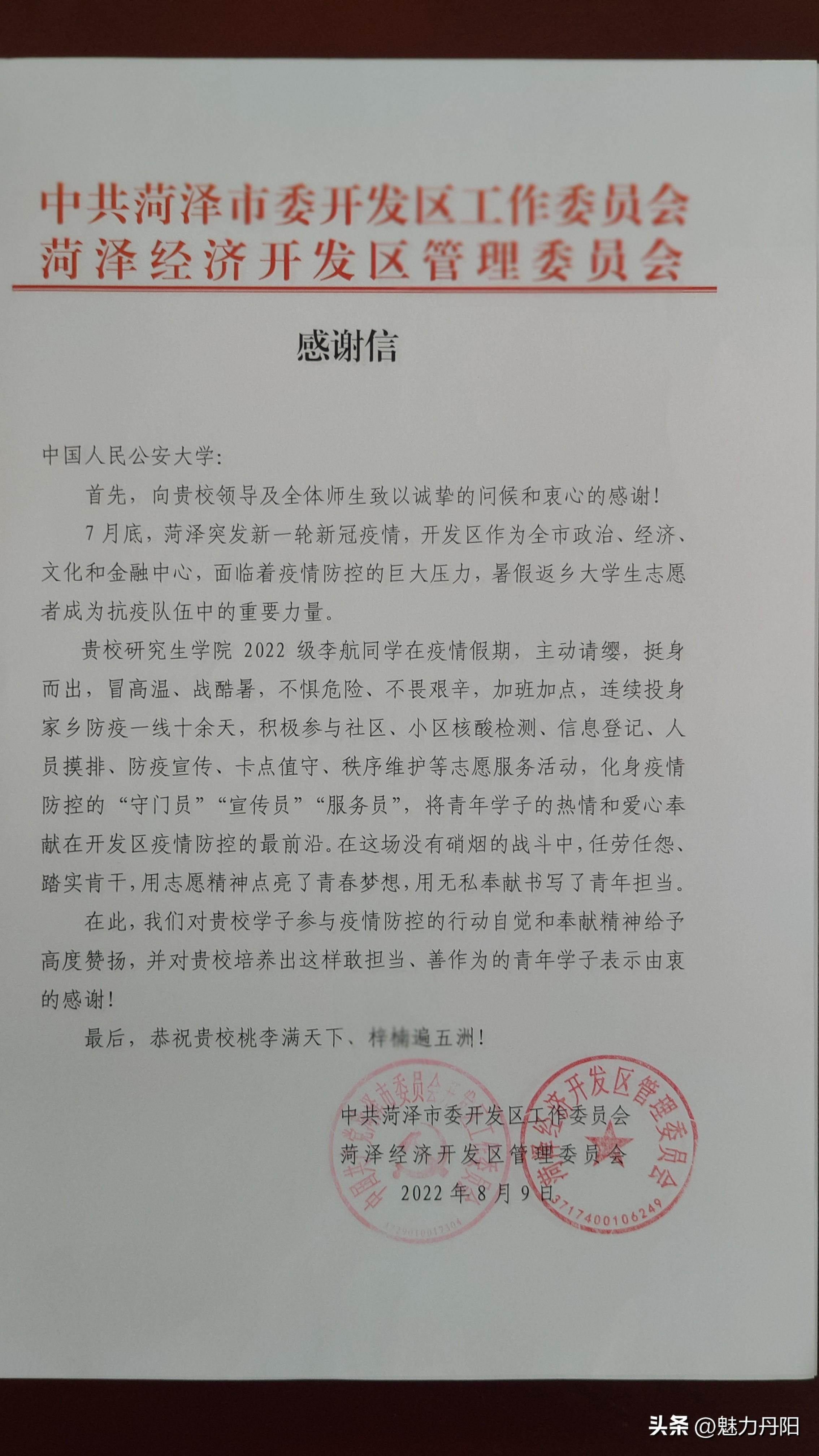 信中写道:7月底,菏泽突发新一轮新冠疫情,开发区作为全市政治、经济、文化和金融中心,面临着疫情防控的巨大压力,暑假返乡大学生志愿者成为抗疫队伍中的重要力量。
