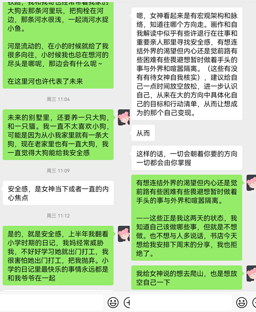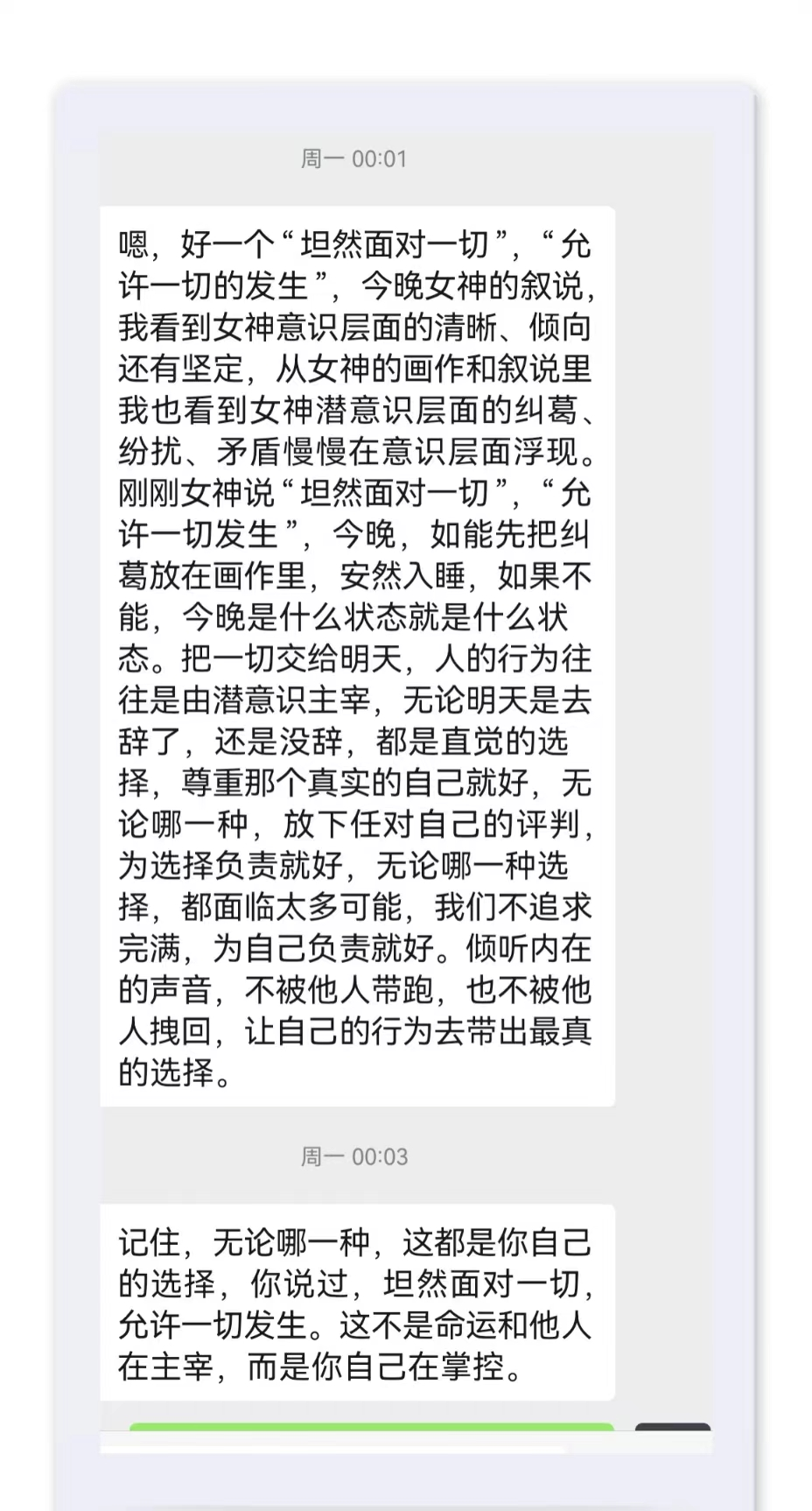 当天晚上,我的女神老师一直在对我进行心理疗愈,因为辞职真的是我人生中的一件大事。我的爷爷,我的父辈,都是安稳的工作,家族里从来没有一个开荒者,而我要去走这样一条不寻常的路,注定无比艰难。