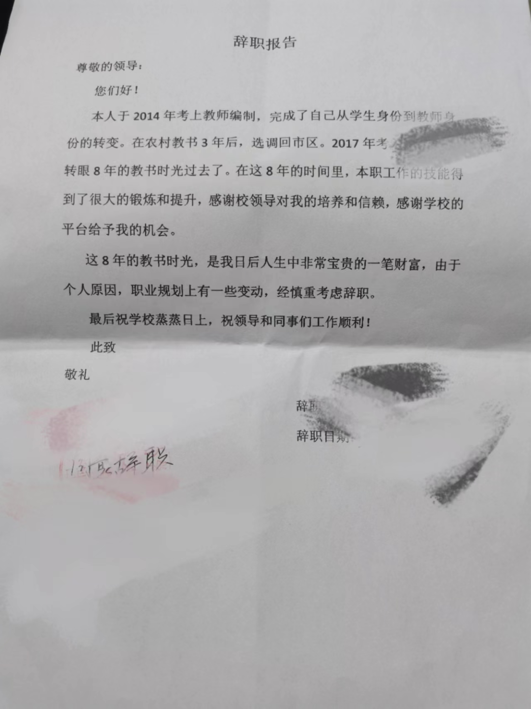 所以为了不耽误学校的工作,在25号这天就提出了辞职,26号这天去交的辞职报告。