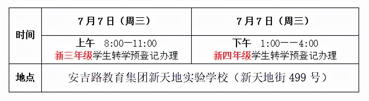 请按预约时间提前5分钟来校办理,切勿误期,无需带孩子。安吉路教育集团新天地实验学校为九年一贯学制,所有学生不参加杭外和民办的摇号。现为集体办理转学预登记,录取顺序严格根据市教育局公布的录取办法,最后以收到录取通知书为准!⭐ 教学处电话:0571-81112690