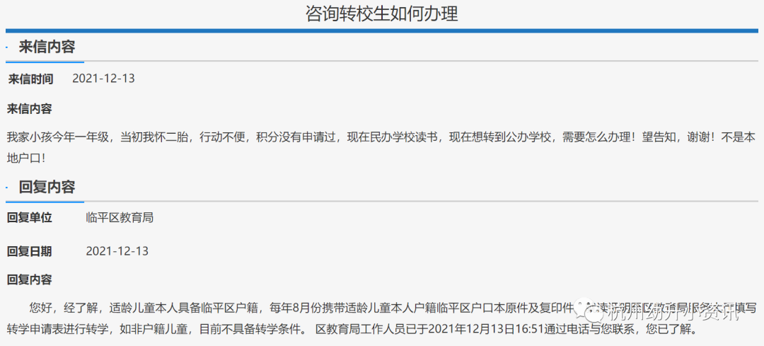 近期,有临平家长在教育局官网咨询转校生办理问题,教育局给出相关回答
