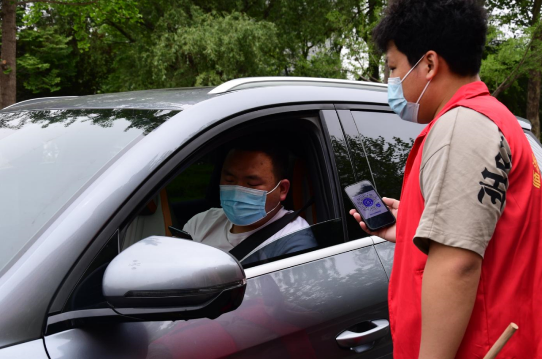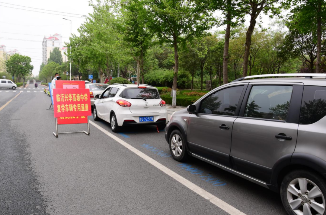 在临沂兴华高级中心校门外,记者看到,送学生的家长开车有序通过复学车辆专用通道,长长的通道上,每隔几米就有一位志愿者或是查看沂码通、或是疏导交通……
