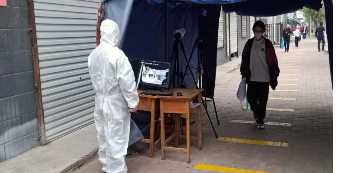 进入教室前班主任已给教室通风,教师们在教室门口给学生再次测量体温,学生上交居家隔离记录表、健康通行证打印码、入校承诺书。