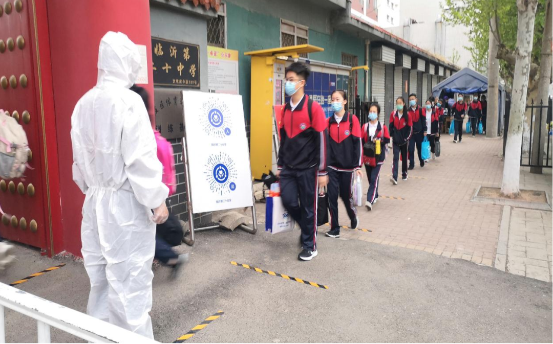 4月25日,临沂第二十中学迎来了复学第一天,校园内春光无限好,学生们朝气又蓬勃。一大早,学校领导和值班老师站在学校门口迎接返校学生。学生保持一米线、依次测温后进入校园。