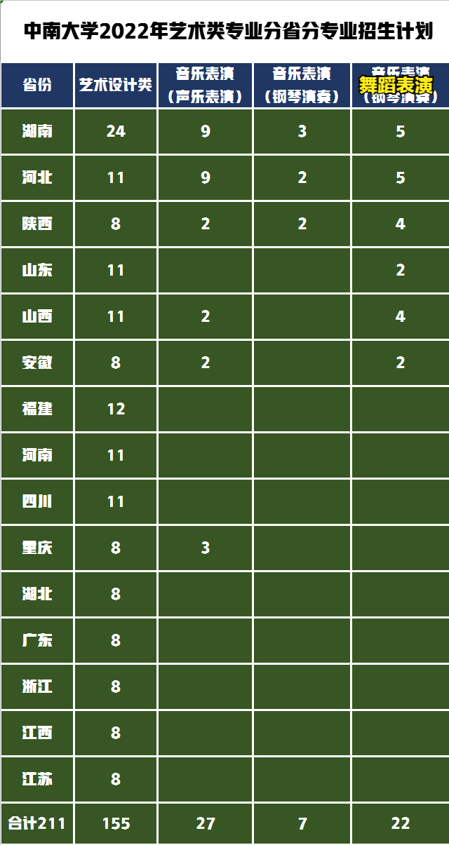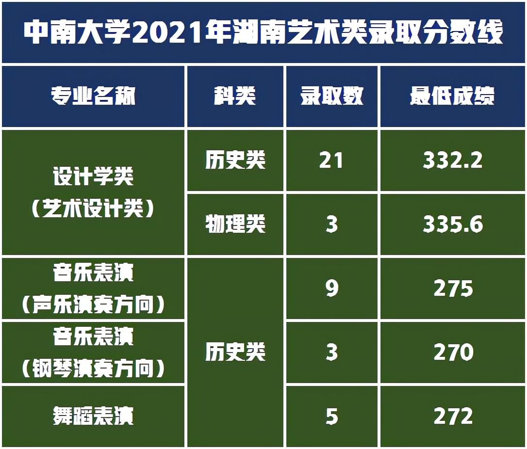 中南大学是教育部直属的“双一流”A类建设高校,2022年1月4日中南大学官网发布了《中南大学2022年艺术类专业招生简章》,明确了2022年艺术类招生的专业为音乐表演类、舞蹈表演类和艺术设计类招生211人,2022年艺术类专业录取需要多少分呢?