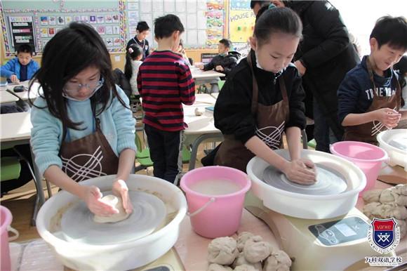 拉坯是制作陶瓷的七十二道工序之一,是成型的最初阶段,也是器物的雏形制作。拉坯需要专心、耐心和细心,三年级的孩子们在制作的过程中带着这些可贵的精神品质,感受着双手创造艺术作品的魅力。