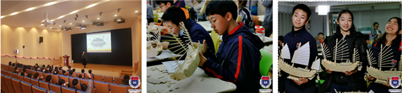 中国是世界上造船历史最悠久的国家之一,在历史上形成了丰富多样的船型。其中“绿眉毛”是古老的木制舵,因船头似鸟嘴呈尖型,又称“鸟船”,因船头眼上方有条绿色眉而得名,是我国鸟船系列中的优秀船型。我们初中部的学生在听了关于船舶进化的讲座后,更是亲手参与了古帆船的制作,真正地将理论与实践相结合!