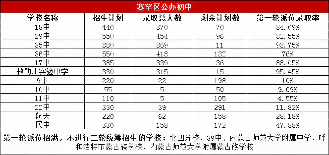 以下为2020年小升初第一轮派位赛罕区各公办初中招生、派位、录取情况: