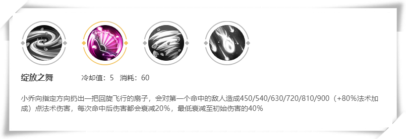 小乔向指定方向扔出一把回旋飞行的扇子,会对第一个命中的敌人造成450/540/630/720/810/900(+80%法术加成)点法术伤害,每次命中后伤害都会衰减20%,最低衰减至初始伤害的40%。